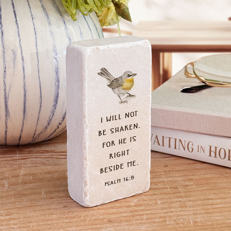Bring faith, inspiration, and beauty into your home with the Twelve Stone Art Scripture Stone featuring Psalm 16:8: “I have set the Lord always before me; because He is at my right hand, I shall not be shaken.”