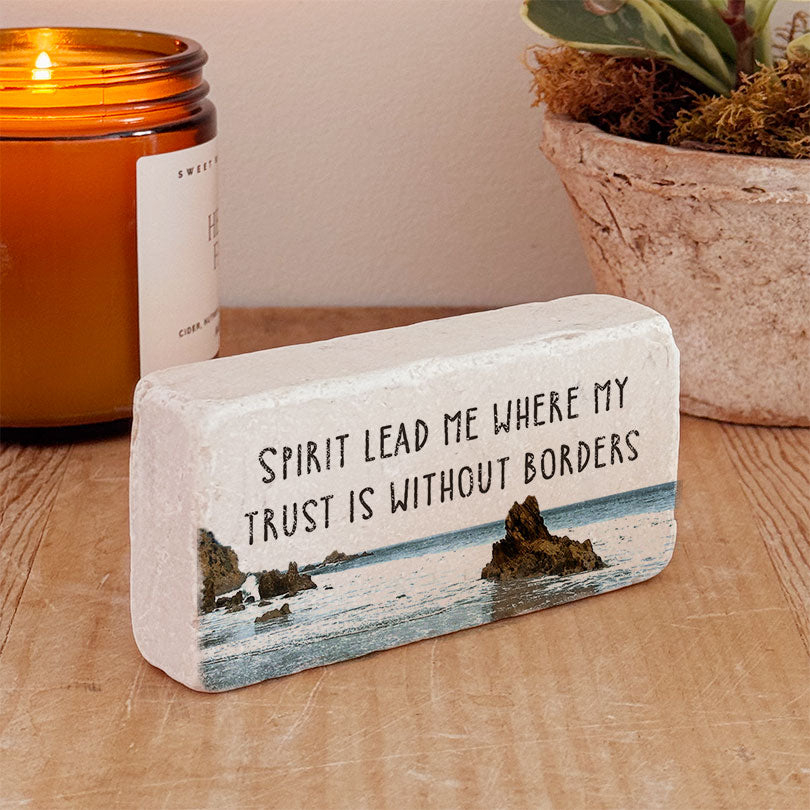 Bring daily inspiration and faith into your home with this beautifully handcrafted Twelve Stone Art Scripture Stone. Handmade with the uplifting message, “Spirit, lead me where my trust is without borders”, this stone serves as a gentle reminder to trust God fully and follow His guidance in every area of life.